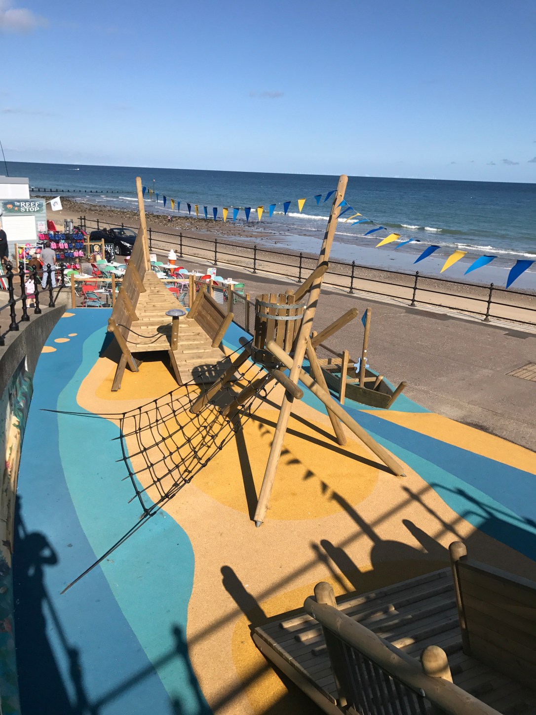 Conscious that we needed to get back to the cottage for a bite to eat before a wedding coach collected us at 12.15 we wanted to make the most of our time in Norfolk. Thankfully, travelling with young children means we’re up at 6am and dressed and fed by 8am. So after a morning snooze for our youngest we were in Cromer in time for a morning coffee (and ice cream!) at 10am. Parking in the main town carpark (at the junction between Runton Road and Beach Road) we stumbled across an epic pirate play park on the beach front – both of our little people loved it!