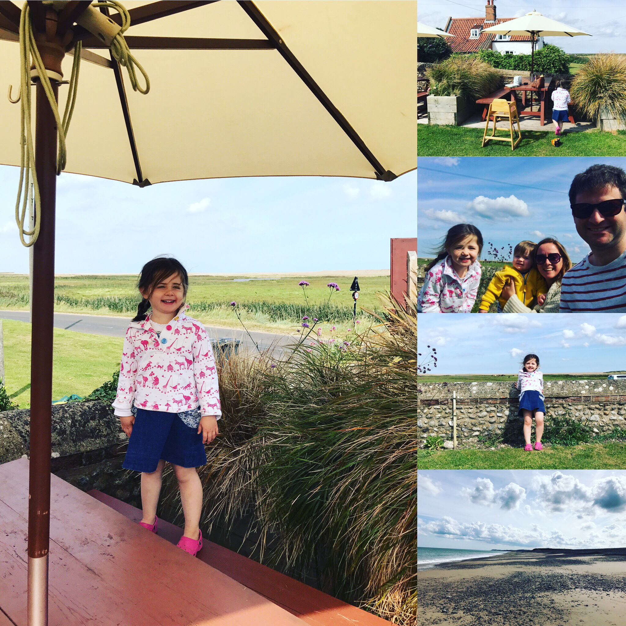 So the morning was spent on the pebbly beach at Salthouse (no better way to cue a mild hangover!). It was deserted and the children loved running around, chasing waves and building pebble towers. We (or they!) managed to abscond with a fair number of said pebbles, hidden in my handbag (I thought my bag was heavy at work the following day!). After a few hours of fresh air on the beach we drove the short distance to the Dun Cow pub in Salthouse. There was some parking on the village green but I imagine it get’s pretty busy during the peak summer months. The pub doesn’t take bookings so you may want to arrive early. Now, this summer hasn’t been the best but the weather was kind and we enjoyed a home cooked meal in the pub garden overlooking the sea (it doesn’t get better than this!).