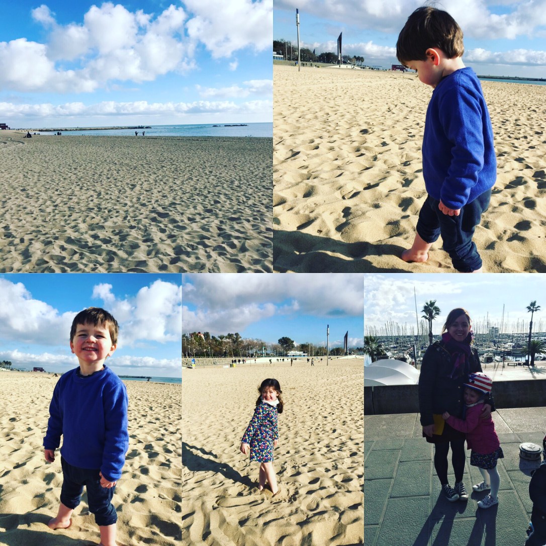 What’s more perfect than a walk along the beach after a slightly heavy night?!? We grabbed some yummy croissants from on Carrer Bailen (in Gracia where we were staying) before jumping in a taxi to take the short ride through a sleepy city to El Peix, a 52m long golden fish sculpture on Barcelona’s seafront – ask to be dropped at Barcelona Casino. We found a nice bench overlooking the boats and had our second breakfast (a major perk of parenting!) The morning was spent playing on the beach (it was a balmy 17 degrees!).